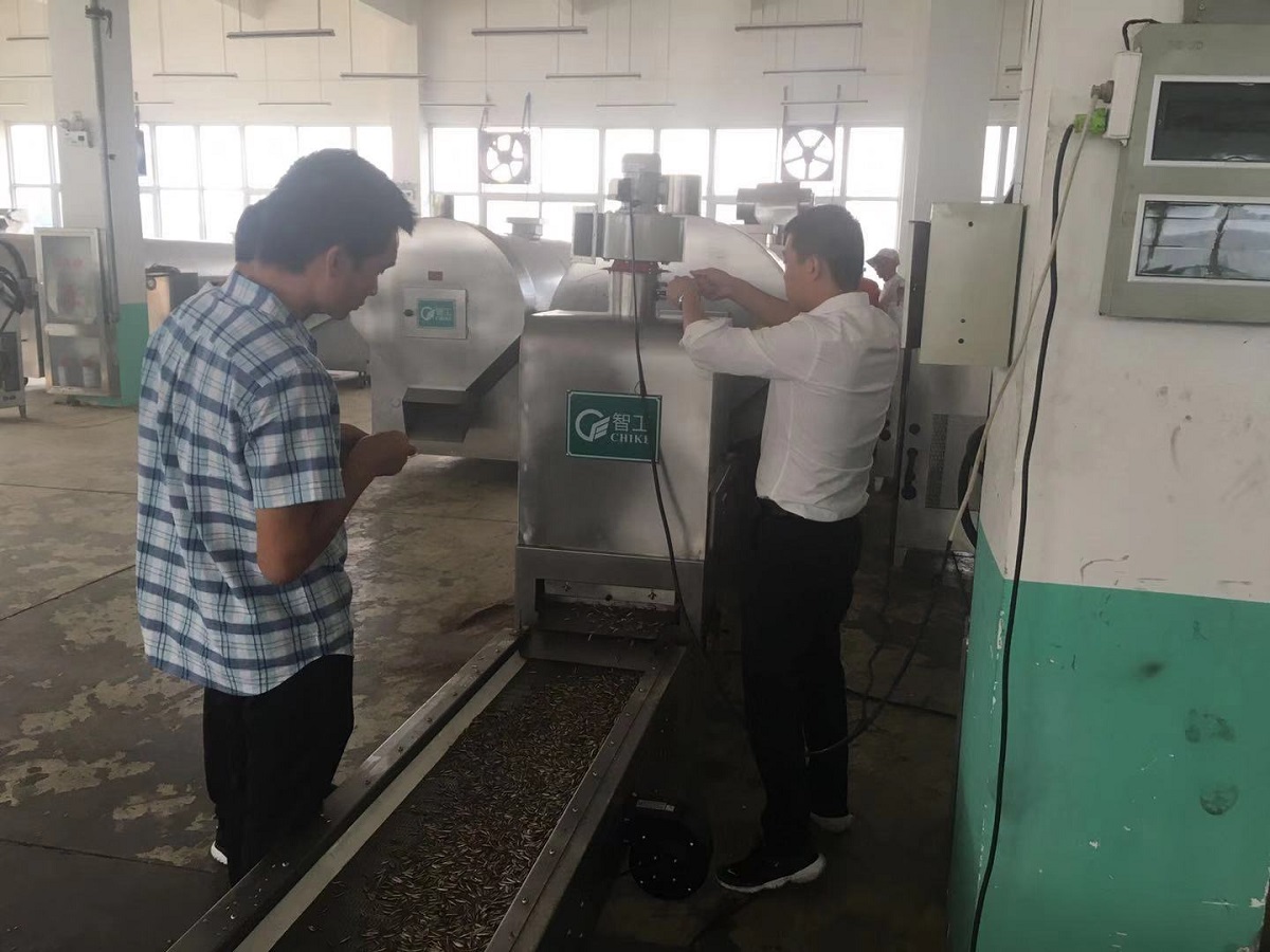 10月3日湖北客户来我厂试机全自动4米电磁流水线炒制瓜子。